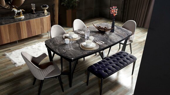 Die Kombination aus Schwarz und Grau verleiht diesem Set eine zeitlose Eleganz, die zu verschiedenen Einrichtungsstilen passt und Ihrem Esszimmer eine moderne Atmosphäre verleiht.