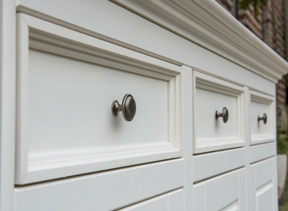 Die Anrichte im Landhausstil ist ein charmantes Möbelstück für Ihr Zuhause, das traditionelle Eleganz mit praktischer Funktionalität vereint. Mit Abmessungen von ca. 130 x 45 x 85 cm (Länge x Breite x Höhe) bietet diese Anrichte aus Echtholz ausreichend Stauraum und Platz für Ihre Gegenstände. Sie verfügt über drei Schubladen und drei Türen im klassischen Stil, die nicht nur dekorativ sind, sondern auch praktischen Stauraum bieten. Die weiß gestrichene Oberfläche verleiht ihr ein helles und frisches Aussehen, während das echte Holz-Innengestell für Stabilität und Langlebigkeit sorgt. Die Artikelnummer EAN lautet: 4062292588921.