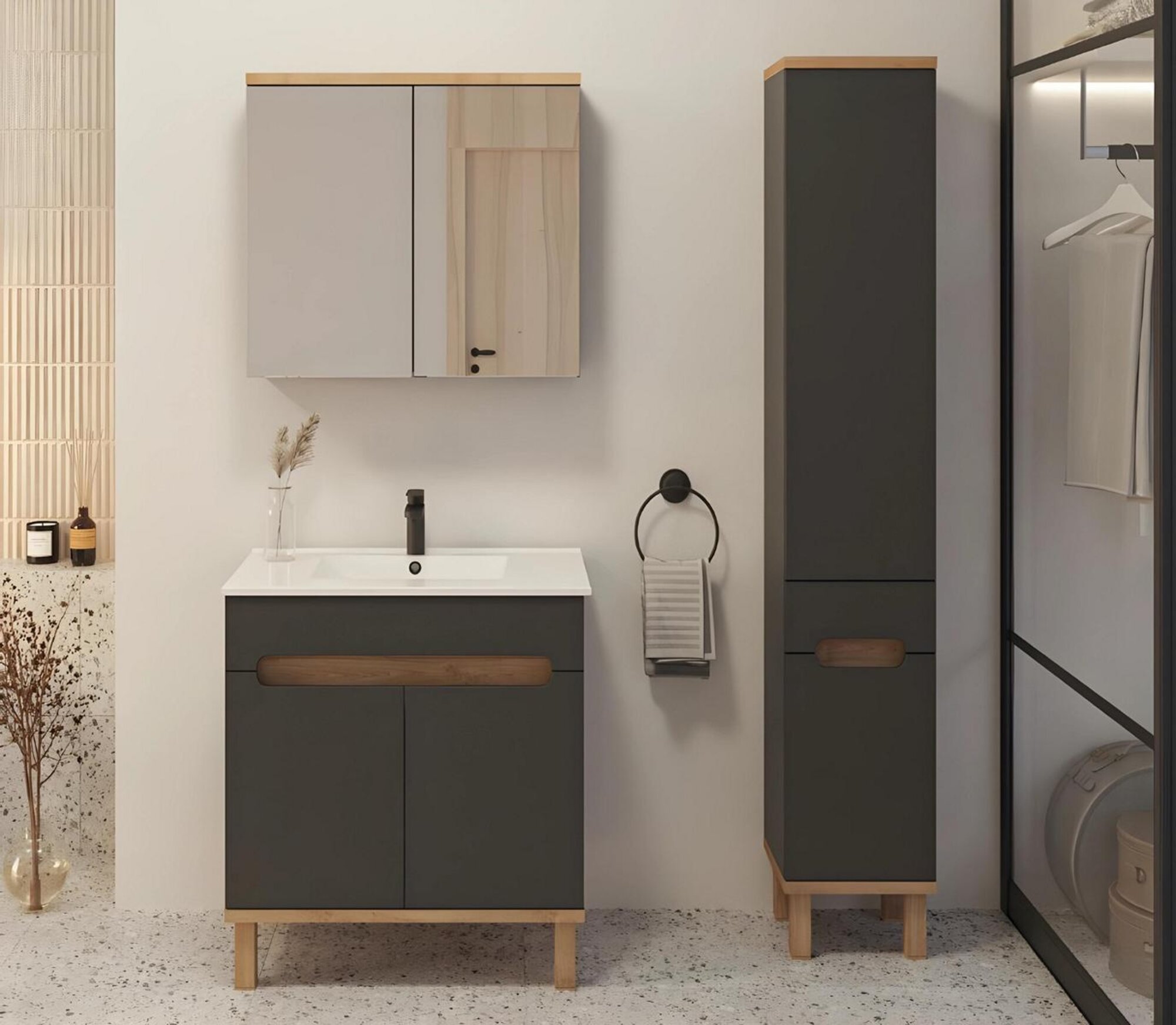 Entdecken Sie den Badezimmerschrank von JV Möbel, der in einem stilvollen grauen Farbton gehalten ist. Dieser Waschtischunterschrank bietet nicht nur ausreichend Stauraum mit einer Schublade und praktischen Türen, sondern ist auch aus hochwertigem Holz gefertigt. Mit den kompakten Abmessungen von ca. 59.7 x 45.6 x 80 cm passt er perfekt in jedes Badezimmer und sorgt für eine moderne Atmosphäre.