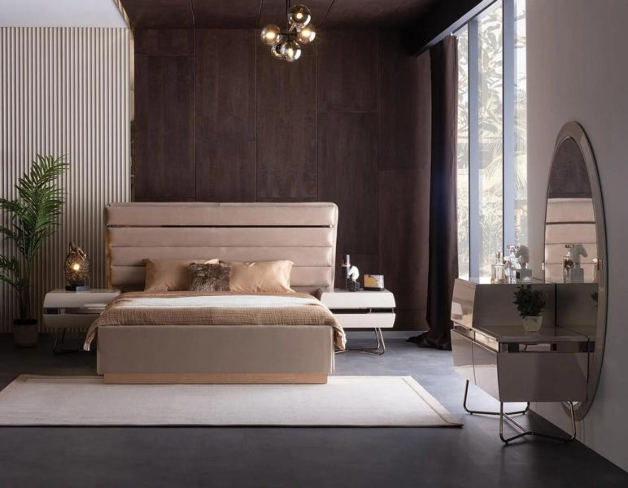 Entdecken Sie das elegante 5-teilige Schlafzimmer Set von JV Möbel, das aus einem Bett, zwei Nachttischen, einer Kommode und einem großen Spiegel besteht. Dieses moderne Set in beige bringt Eleganz und Stil in jedes Schlafzimmer. Mit großzügigen Maßen von 215 x 226 x 130 cm bietet das Bett eine komfortable Liegefläche von 200 x 200 cm. Die Kommode misst 128 x 50 x 86,5 cm, während jeder Nachttisch mit den Maßen 67 x 50 x 56 cm viel Stauraum für Ihre persönlichen Gegenstände bietet.