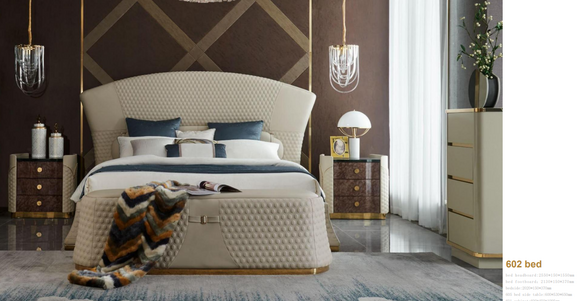 Die zwei Nachttische ergänzen das Set perfekt und bieten praktischen Stauraum für Ihre persönlichen Gegenstände. Jeder Nachttisch misst ca. 60 x 53 x 65 cm und ist ebenso in Beige gehalten, was ein einheitliches und stilvolles Gesamtbild schafft. Die Kombination aus hochwertigen Materialien wie Holz, Edelstahl und Leder unterstreicht den luxuriösen Charakter dieser Möbelstücke. Das Innengestell aus echtem Holz sorgt für Stabilität und Langlebigkeit, während die Lederpolsterung dem Bett einen Hauch von Exklusivität verleiht.
