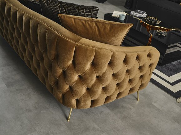 Das Sofa besticht durch seine sanfte Sandgelbe Farbe, die einen Hauch von Sonnenschein in Ihr Zuhause bringt. Die goldenen Beine aus robustem Holz verleihen ihm nicht nur Stabilität, sondern setzen auch einen luxuriösen Akzent. Das Chesterfield-Design mit den charakteristischen Knopfheftungen an der Rückenlehne unterstreicht den zeitlosen Charme dieses Möbelstücks.
