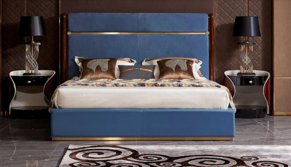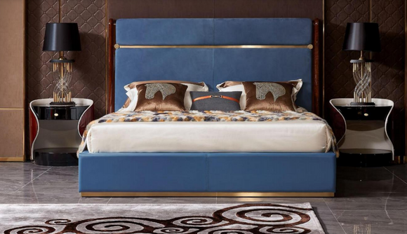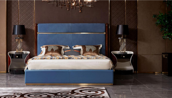 Dieses luxuriöse 3-teilige Schlafzimmer-Set in Blau-Weiß vereint elegantes Design mit höchster Qualität. Im Mittelpunkt steht das Bett mit einer großzügigen Liegefläche von ca. 180 x 200 cm und den Gesamtmaßen von ca. 226 cm Länge, 145,5 cm Höhe und 210/195 cm Breite. Das Bettgestell aus hochwertigem Holz und Edelstahl strahlt Stabilität aus und wird durch die harmonische Blau-Weiß-Farbgebung zu einem Highlight im Schlafzimmer.