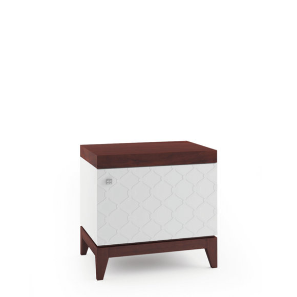 Die mehrfarbige Gestaltung in Weiß und Braun verleiht diesem Nachttisch eine zeitgemäße Note, die gut zu verschiedenen Einrichtungsstilen passt. Der Korpus besteht aus hochwertigem Massivholz, das sorgfältig lackiert wurde, um einen glänzenden Hochglanzeffekt zu erzielen und gleichzeitig seine Langlebigkeit zu gewährleisten. Die Rückwand und die Einlegeböden bestehen aus MDF (mitteldichte Holzfaserplatte), die furniert und ebenfalls lackiert wurden, um eine robuste Struktur und ein harmonisches Gesamtbild zu schaffen.