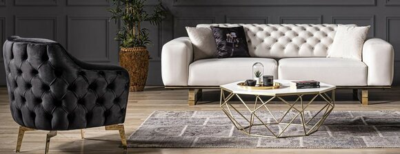 Entdecken Sie mit unserem luxuriösen Dreisitzer Chesterfield Sofa in Grauweiß mit goldenen Beinen die perfekte Verbindung von Eleganz und Komfort für Ihr Zuhause. Egal, ob für gemütliche Abende allein oder für gesellige Zusammenkünfte mit Freunden – dieses Sofa bietet Ihnen den idealen Platz zum Entspannen und Genießen in einem luxuriösen Ambiente.