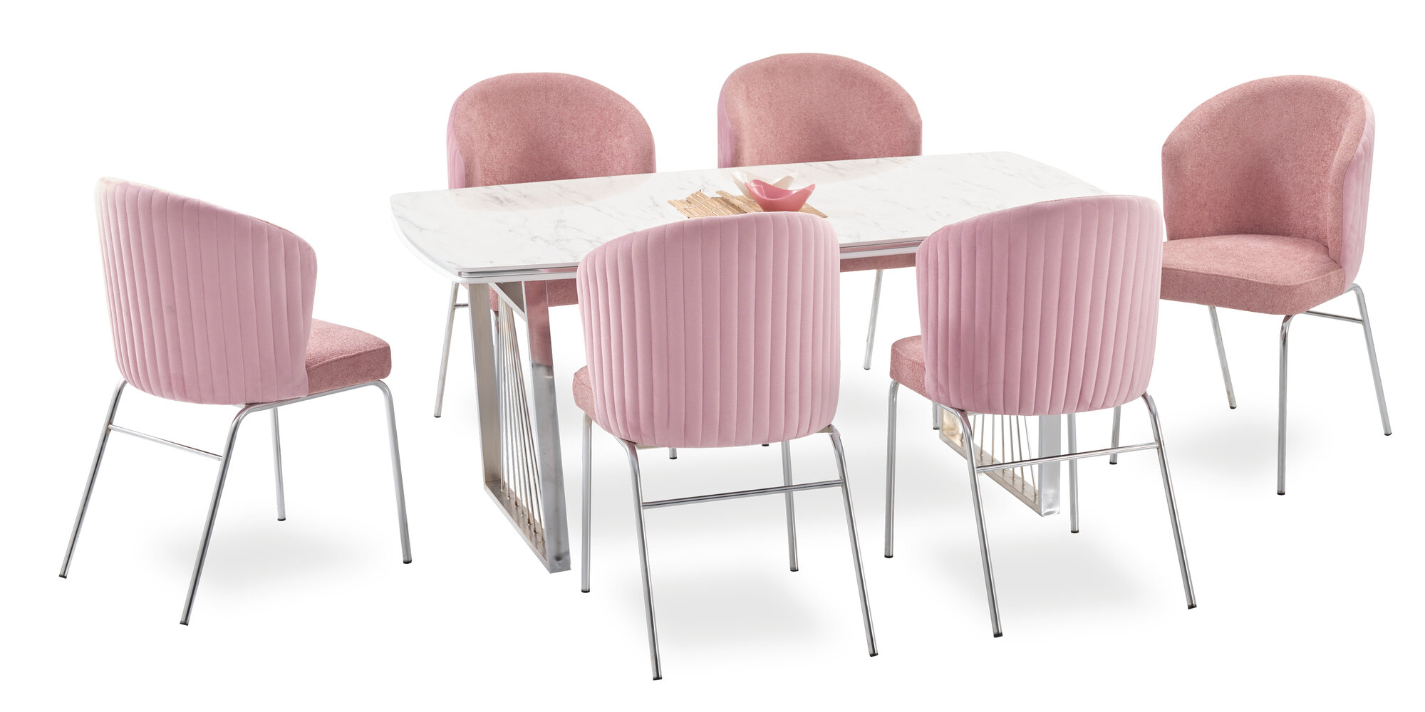 Entdecken Sie die elegante Essgruppe von JV Möbel, die aus einem **modernen** Esstisch und sechs stilvollen Stühlen besteht. Dieses **7-teilige Set** ist perfekt für Ihr Esszimmer und bietet Platz für bis zu **6 Personen**. Der rechteckige Esstisch hat die Maße **140 x 90 x 75 cm** und ist aus hochwertigem **Holz** gefertigt, während die Stühle eine Sitzhöhe von **47 cm** bieten. In einem ansprechenden **rosafarbenen** Design mit marmorierter Oberfläche fügt sich diese Gruppe harmonisch in jede moderne Einrichtung ein.