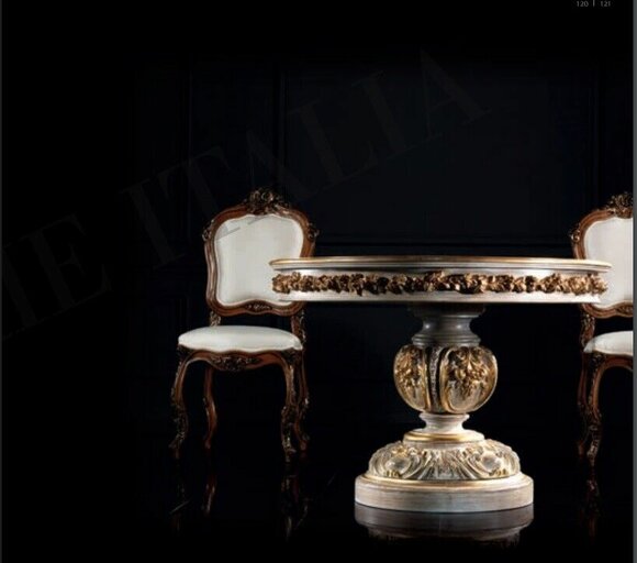 Edles Design: Der Esstisch besticht durch seine runde Formgebung, die geschwungenen Linien und die edle Farbgebung in Weiß und Gold. Der Barockstil und die hochwertigen Details verleihen dem Esstisch einen eleganten Charakter und machen ihn zu einem echten Blickfang in Ihrem Esszimmer.