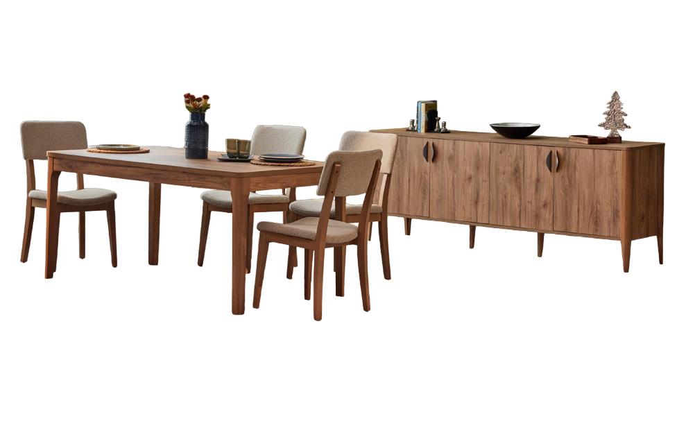 Entdecken Sie unser **6-teiliges Esszimmer Set** von **JV Möbel**, das Ihrem Zuhause einen modernen und zeitgenössischen Touch verleiht. Das Set besteht aus einem **rechteckigen Esstisch** mit den Maßen ca. **160 x 90 x 75 cm** sowie vier eleganten Stühlen und einer **Anrichte** von ca. **213 x 49 x 80 cm**. Die **dunkle Holzoptik** und das einfarbige Design sorgen für eine stilvolle Atmosphäre in Ihrem Esszimmer. Die Stühle haben eine Sitzhöhe von **47 cm** und bieten damit optimalen Komfort für Ihre Gäste.