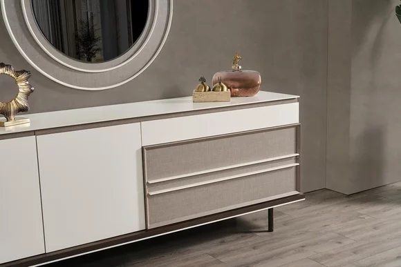 Sideboard: Das Sideboard mit ca. 220 x 50 x 82 cm bietet nicht nur reichlich Stauraum für Geschirr, Besteck und andere Esszimmerutensilien, sondern dient auch als stilvolles Dekorationselement. Seine robuste Holzkonstruktion und die mehrfarbige Lackierung machen es zu einem zeitlosen Möbelstück, das Ihren Wohnraum aufwertet.