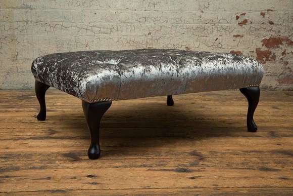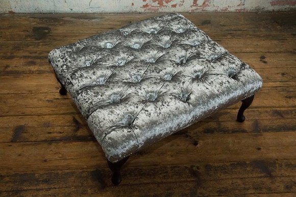 Ein markantes Merkmal dieses Hockers sind die Kristallsteine, die anstelle der regulären Knöpfe angebracht werden können. Kunden haben die Wahl zwischen Standard-Kristallsteinen oder hochwertigen Swarovski Kristallsteinen, die dem Hocker eine zusätzliche Note von Eleganz verleihen. Diese Details unterstreichen die Liebe zum Detail und die Möglichkeit, das Möbelstück nach persönlichem Geschmack zu gestalten.