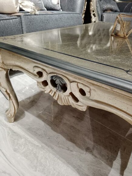 Design und Materialien: Der Couchtisch ist aus erstklassigem Holz gefertigt und in einer edlen Goldfarbe gehalten, die seine luxuriöse Ausstrahlung betont. Das klassische Design mit sorgfältig gearbeiteten Details und einer großzügigen Tischplatte macht diesen Tisch zu einem zeitlosen Schmuckstück.