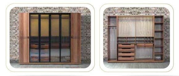 Das Design in warmem Braun verleiht dem Raum eine gemütliche Atmosphäre und strahlt gleichzeitig Eleganz aus. Die Glasfronten fügen einen modernen Touch hinzu, der das Schlafzimmer aufwertet und einen Hauch von Raffinesse verleiht. Sie ermöglichen zudem einen schnellen Überblick über den Inhalt des Schranks, was die tägliche Auswahl Ihrer Kleidung erleichtert.