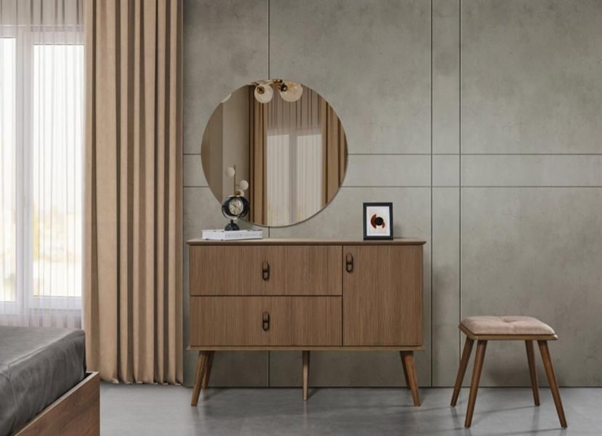 Entdecken Sie das stilvolle Kommode Schminktisch Spiegel Hocker Set von JV Möbel, das perfekt für Ihr Schlafzimmer geeignet ist. Dieses Set umfasst alles, was Sie für Ihre tägliche Schönheitsroutine benötigen: einen eleganten Spiegel, eine praktische Kommode und einen bequemen Hocker. Mit einer Breite von 44 cm und einer Länge von 120 cm bietet die Kommode ausreichend Platz für Ihre Kosmetikartikel und Accessoires. Der moderne Stil und der mitteldunkle Holzton verleihen Ihrem Raum eine zeitgemäße Note.