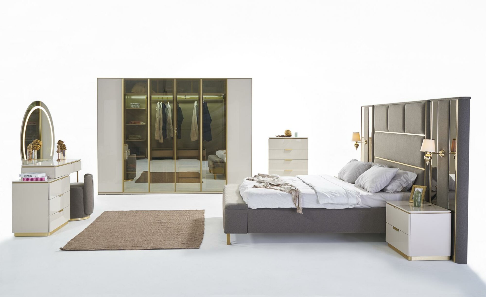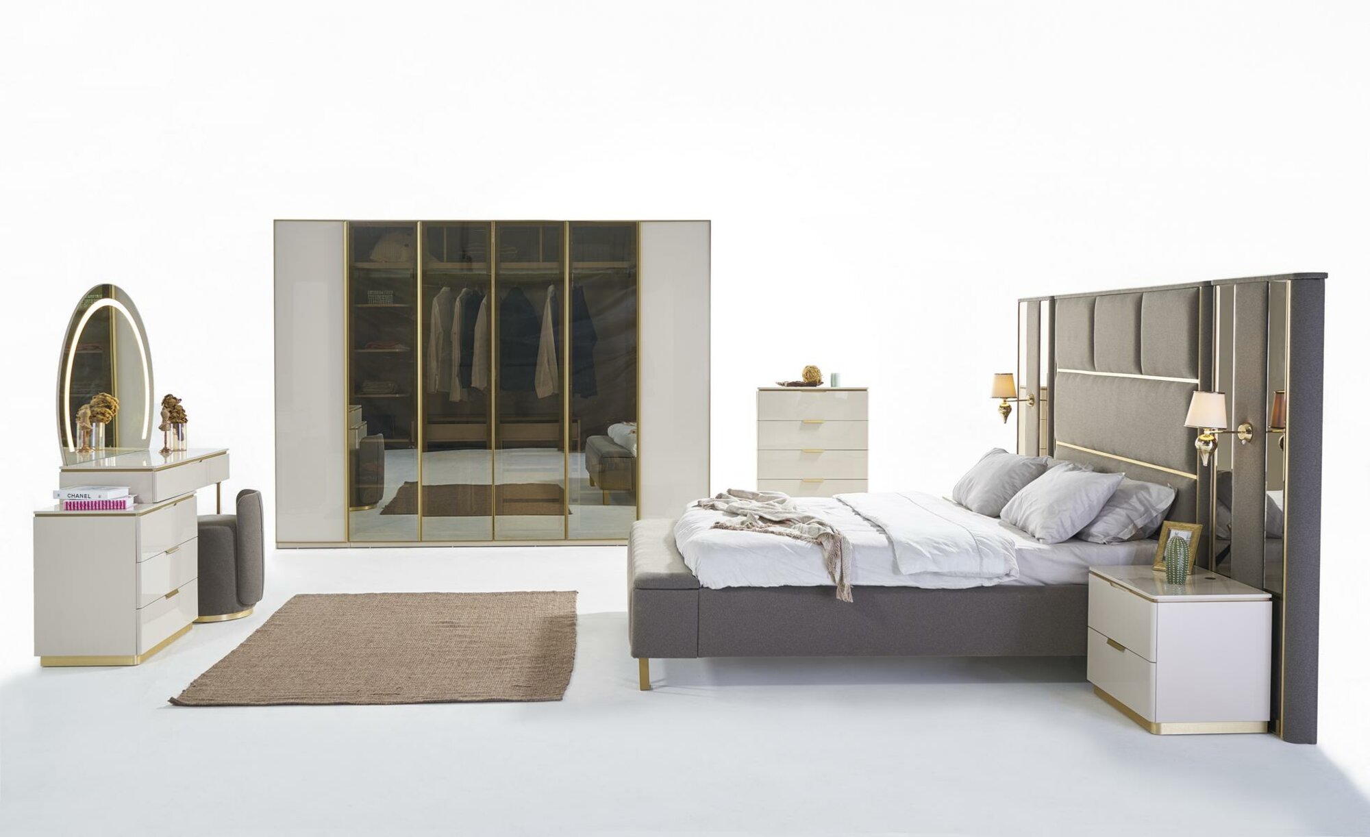 Entdecken Sie unser Luxus Schlafzimmer Set von JV Möbel, das aus insgesamt 7 Teilen besteht. Dieses stilvolle Set enthält ein Bett mit einer Liegefläche von 160 x 200 cm, einen eleganten Nachttisch, eine praktische Kommode, einen stilvollen Schminktisch, einen geräumigen Kleiderschrank und einen modernen Spiegel. Die Möbel sind in einem zeitlosen grauen Farbton gehalten und aus hochwertigem Holz gefertigt. Die Montage ist nicht erforderlich, da die Möbel freistehend sind und sofort in Ihrem Schlafzimmer eingesetzt werden können.