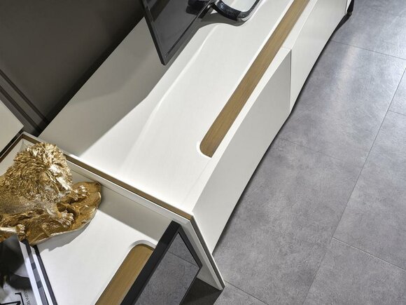 Alle Elemente der Wohnwand sind in einem strahlenden Weiß gehalten, das Ihrem Wohnzimmer eine helle und freundliche Atmosphäre verleiht. Das verwendete Holzmaterial sorgt für Stabilität und Langlebigkeit und verleiht der Wohnwand ein elegantes Erscheinungsbild.