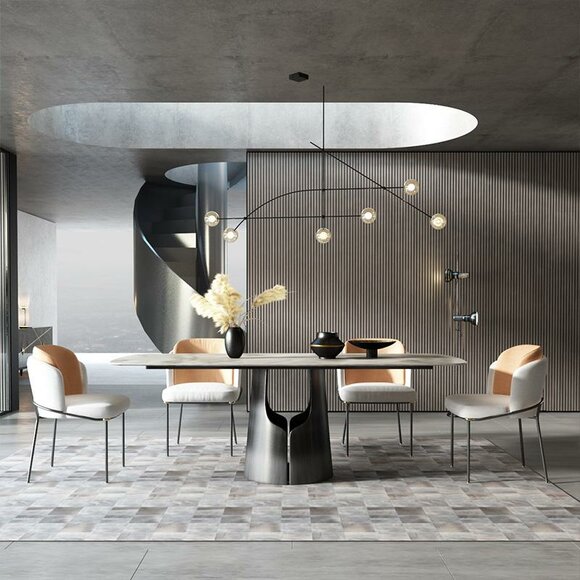 Dieses Esszimmer-Set beeindruckt durch seine hochwertige Verarbeitung und das luxuriöse Erscheinungsbild. Der Esstisch mit einer Tischplatte aus Marmor-Imitation und einem stabilen Edelstahlgestell strahlt Eleganz und Modernität aus. Die sechs dazugehörigen Stühle bieten durch ihr ergonomisches Design und die hochwertigen Materialien hervorragenden Sitzkomfort.