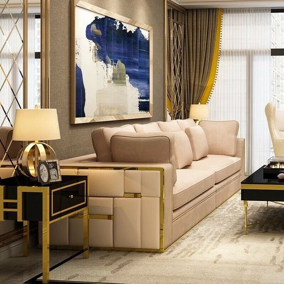 Besonderheiten: Diese Designer Couchgarnitur besticht durch ihre außergewöhnliche Kombination aus Metallelementen und hochwertigen Bezügen. Die Verwendung von Premium Materialien und das moderne Design machen diese Garnitur zu einem echten Blickfang in Ihrem Wohnzimmer.