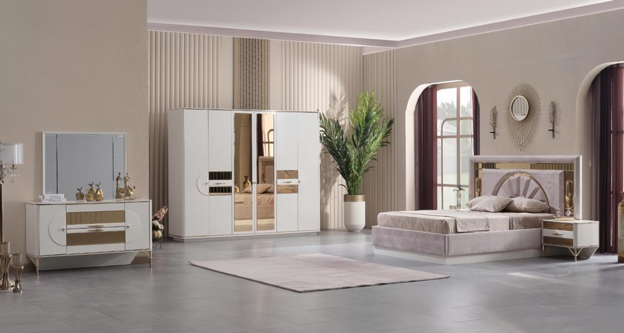 Entdecken Sie das **schicke 5-teilige Schlafzimmer Komplettset** von **JV Möbel**, das alles bietet, was Sie für ein modernes und stilvolles Schlafzimmer benötigen. Dieses Set umfasst einen **Kleiderschrank** mit großzügigen **Maßen von 260 x 62 x 220 cm**, zwei **Nachttische** (jeweils 65 x 45 x 52 cm), einen eleganten **Schminktisch** (144 x 47 x 86 cm) und einen praktischen Spiegel (105 x 2 x 86 cm). Die **Farbe Weiß** und das hochwertige **Holzmaterial** verleihen Ihrem Raum einen zeitgemäßen, einladenden Look.