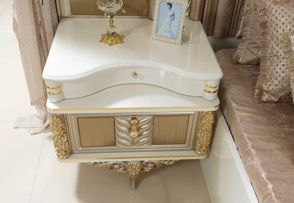Nachttische: Die beiden Nachttische bieten praktischen Stauraum und eine stilvolle Ergänzung zu Ihrem Bett. Die goldenen geschnitzten Elemente verleihen ihnen einen Hauch von Glamour und Raffinesse.