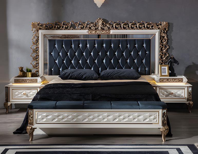 Weiß-Goldene Schlafzimmer Garnitur Doppelbett 2x Nachttische Schrank Set Bett Preis UVP: € 18.590,00 € 16.899,00* 1 Stück (€ 16.899,00 / Stück) Produkt vergleichen auf der Merkliste auf die Merkliste in den Warenkorb