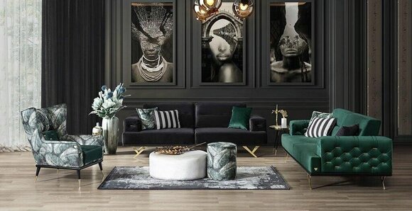 Hergestellt aus hochwertigem Holz mit Edelstahl-Details garantieren unsere Möbelstücke Langlebigkeit und Qualität. Erleben Sie den Luxus und die Eleganz unserer Tannengrün Wohnzimmer Sofagarnitur Sofakollektion und machen Sie Ihr Wohnzimmer zu einem Ort der Entspannung und des modernen Designs.
