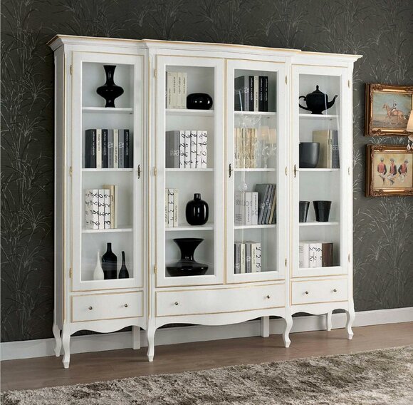 Das integrierte Bücherregal bietet reichlich Platz für Ihre Büchersammlung, während die Vitrine selbst mit großzügigen Glaseinsätzen eine stilvolle Präsentation Ihrer Dekorationsgegenstände ermöglicht.